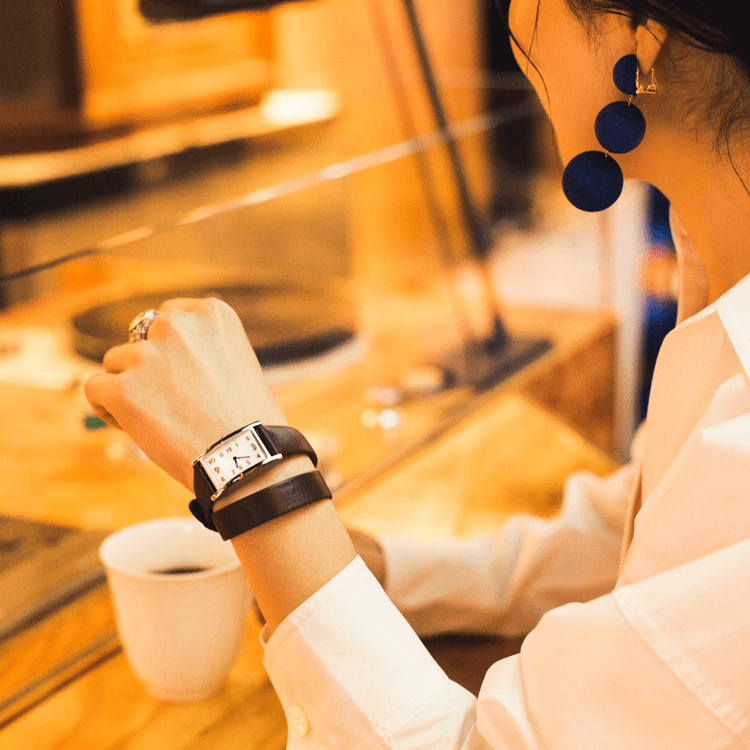 「1日に1回は必ず美味しいコーヒーを飲んで、気持ちを切り替えるようにしています。休憩時は一人で過ごすことが多いので、大好きな音楽が欠かせません。よく行く街にはお気に入りの場所があって、『GINZA MUSIC BAR』もそのひとつ。BARオープン前の『TORIBA COFFEE』のカフェタイムに訪れることが多いですね。このシックな青い空間に合わせて今日はダークブラウンストラップの時計を。アクセサリー感覚でつけられるのに正統派なムードのあるところが好き」