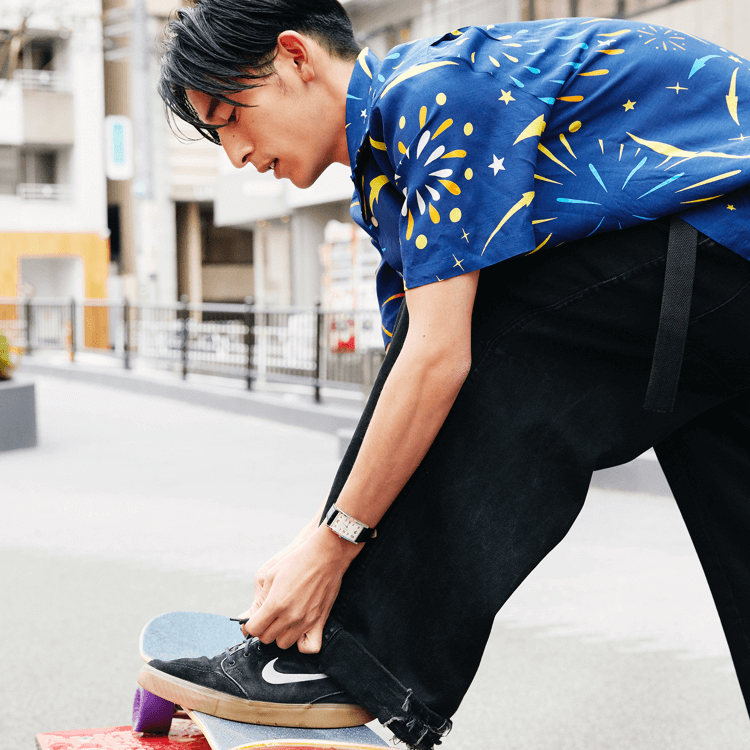 「スケボーは、人が少ない昼過ぎのストリートや、ゴツゴツした坂とか、ちょっと危なそうな場所で滑るとアドレナリンが出てすごく気持ちいいですね。服装はいつもラフでダボっとしたパンツが自分の定番。知人のブランド『ユニオン』のシャツは、カラフルな色使いが気に入ってます。カジュアルなスタイルにこそ、手元にはきちんとした時計を着けておきたいですね。端正なデザインのこの時計は、そんな男の身だしなみを整えてくれる存在です」