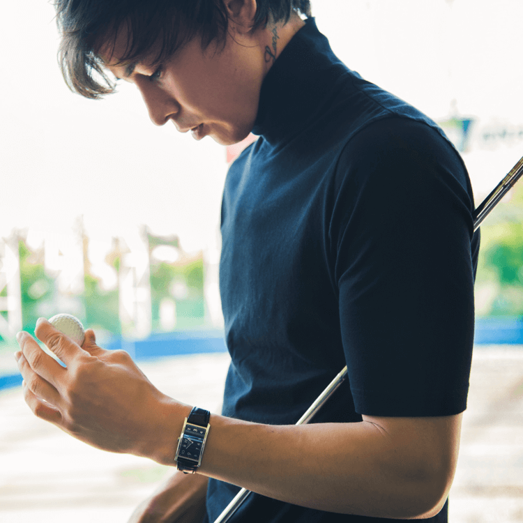 「最近ゴルフにハマッていて、普段の練習は一人が多いですが、気の知れた相手が一緒だとフォームをアドバイスしあえるのが良いですね。『ナイスショット!』って女性からの応援があれば、きっと気持ちよくプレーできるんじゃないかな(笑)。ファッションは、動きやすく、練習の後でもどこかに立ち寄れる服装で。この時計はインデックスの文字が可愛いですね。デザインもシンプルで飽きがこなそう。スポーティなスタイルにもぴったりですね」