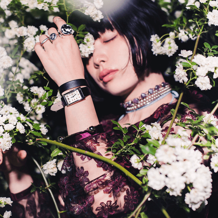 「夜は家から近所の公園にふらっとよく訪れています。夜の公園はどこか幻想的で、安寧とした空気が流れているので落ち着きますね。カメラが好きなので、バラが咲く時期はよく写真を撮りにきます。今日のスタイリングは“ゴス”をテーマに、今私の中で流行っているグリッター素材のトラウザーと、シアーな素材のトップスを合わせました。ブラックの時計は品があり、コーディネートの引き締め役にぴったりです」