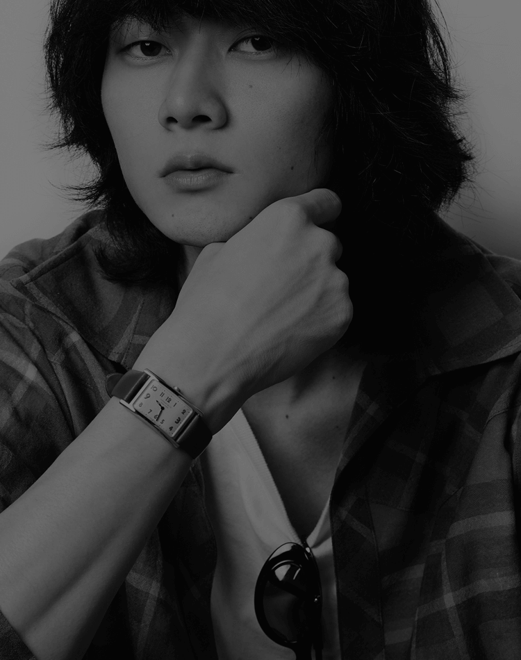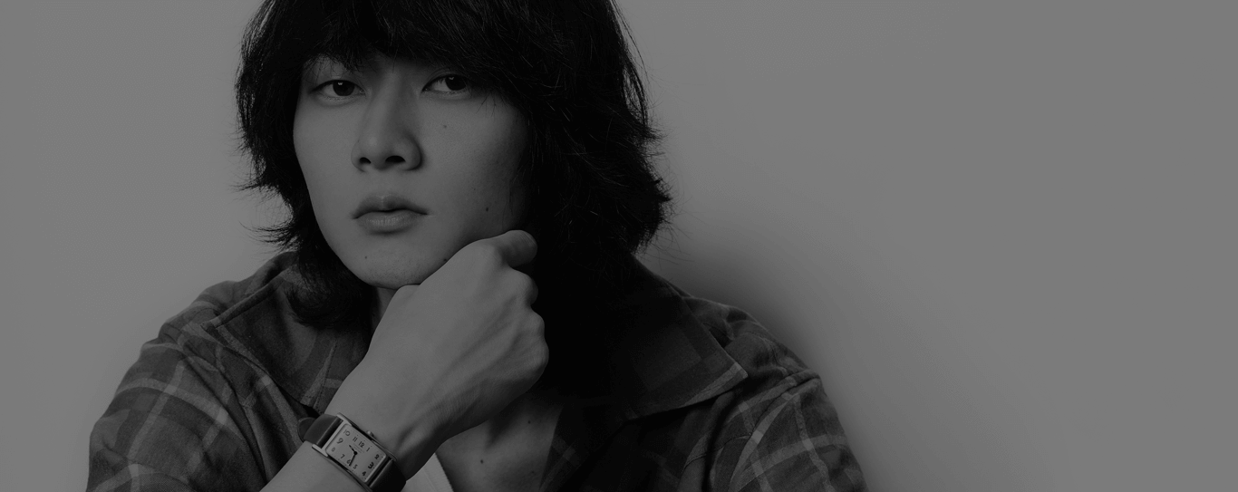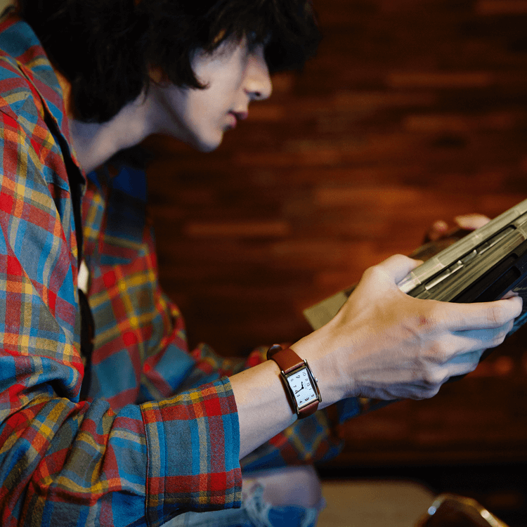 「一日の終わりは、家でくつろぎながら映画鑑賞をすることが多いです。こういうラフな感じで(笑)。外から帰ってきた格好でそのまま映画を観ながらソファーで寝てしまうことも。僕の場合、映画からライフスタイルやファッションの影響を受けることが多く、最近はグランジが気になっています。今日も、着古したネルシャツにダメージデニム、手元にブラウンのストラップを用いた時計を合わせ、自分流に90’sをアレンジしました」