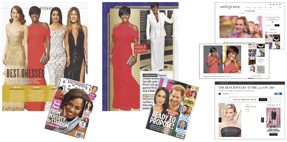 2017年アカデミー賞授賞式やアフターパーティーでのドレスやジュエリーの着用情報は米国のTV、雑誌、ウェブでも報道され、注目を浴びた。米国のエンターテインメント誌「People(ピープル)」では、ヴィオラ・デイヴィスがベストドレッサーとして選ばれ、「ジョルジオ アルマーニ プリヴェ」の赤いドレスに「NIWAKA」のジュエリーを着用したコーディネートが紹介された。また週刊芸能ニュース誌「US Weekly」でも、イヤリングが紹介されている。