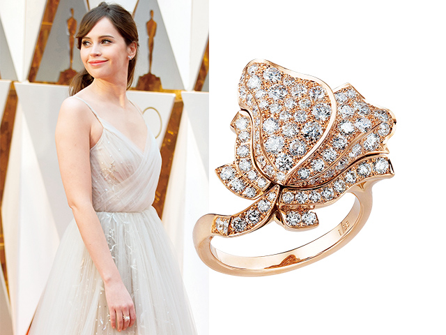 「永遠の生命」や「無限なる成長」の象徴とされ、日本独自の文様として発展した想像上の花、“唐花”をモチーフにしたリング。ピンクゴールドにダイヤモンドをあしらったデザインが、プレゼンターとして登場したフェリシティ・ジョーンズの可憐な印象にぴったり。