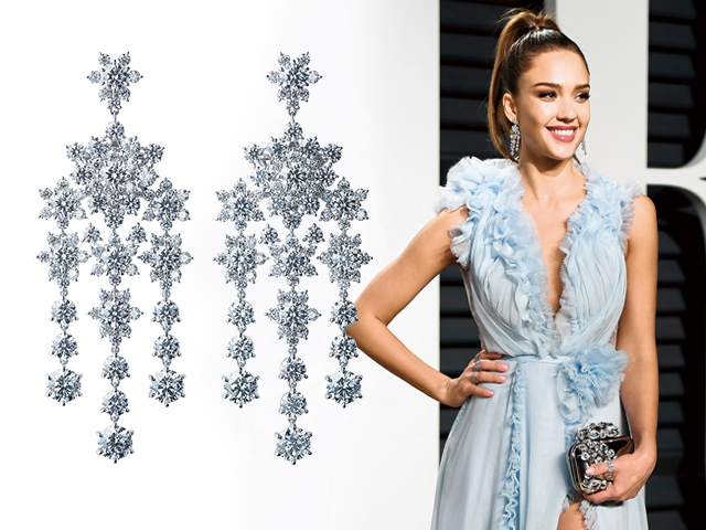 “花雪(はなゆき)”は、雪の結晶よりインスピレーションを受けたデザイン。ジェシカの耳元を彩ったイヤリングは、ダイヤモンドの輝きを最大限に活かすようセッティングされ、太陽の光を反射する雪の結晶のようなきらめきを放った。