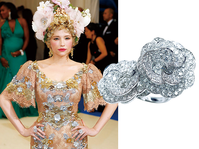 ヘイリー・ベネットは、 “花麗(はなうらら)”のリングを両手に着用し、花々をあしらったヘアーやドレスにコーディネート。ダイヤモンドが敷き詰められた花弁は風に舞うように一枚一枚に動きがあり、立体的なシルエットを際立たせている。