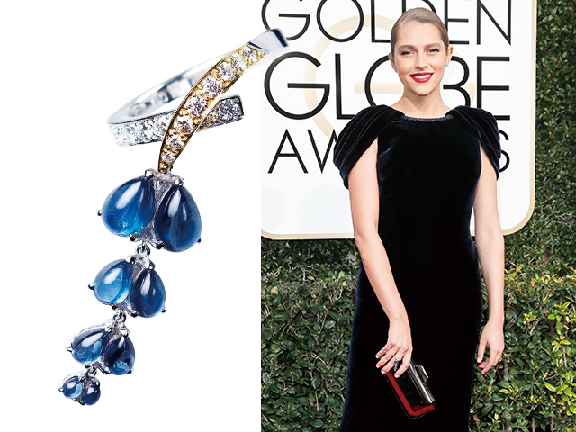 和歌や舞踊の題材として古来より表現される藤の花から着想を得たコレクション“恋香”。テリーサ・パーマーはゴールデン・グローブ賞で、サファイアの花の房が垂れ下がる特徴的なデザインのリングを着用。