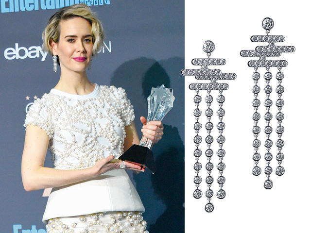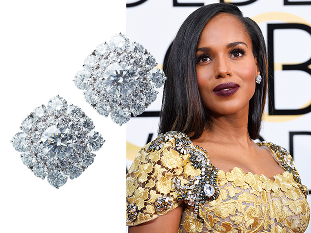 “花車(はなぐるま)”は、平安時代の貴族が使用した「御所車」の車輪をモチーフにしたデザイン。ケリー・ワシントンはゴールデン・グローブ賞で、中心のダイヤモンドをメレダイヤモンドが取り巻き、一段と大きく輝くイヤリングを着用。