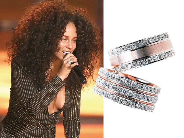 グラミー賞でパフォーマーとして登場したアリシア・キーズが着用したのは、プラチナとピンクゴールドのコンビネーションに、ダイヤモンドを配したリング。幅広のリングを重ねて、ボリューム感と共に存在感をアップさせて着用。