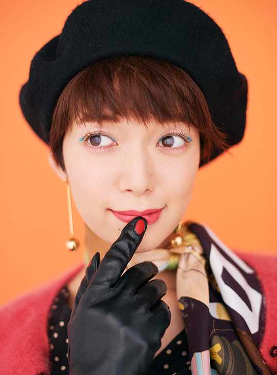 フンワリとしたショートボブと、あどけない笑顔がトレードマークの彼女。普段はベーシックなカジュアルスタイルが多く、メークアップもいたってシンプル。だからこそ、モデル業のときはいつもと違う自分が発見できるのだとか。「撮影では個性的な色や柄の服、トレンドカラーを生かしたメークアップに挑戦できるのが楽しいですね。今日のポイントは、ブルーとピンクのアイライン。さりげなく目元に色を入れることで表情が豊かになります」。佐藤流、愛され笑顔に欠かせない必須アイテムもこっそり紹介。「ちょい濃いめの赤やオレンジ系のカラーリップが最近のお気に入り。唇にポンポンって軽くのせるだけで、発色のよいハッピーな口元が完成します」。