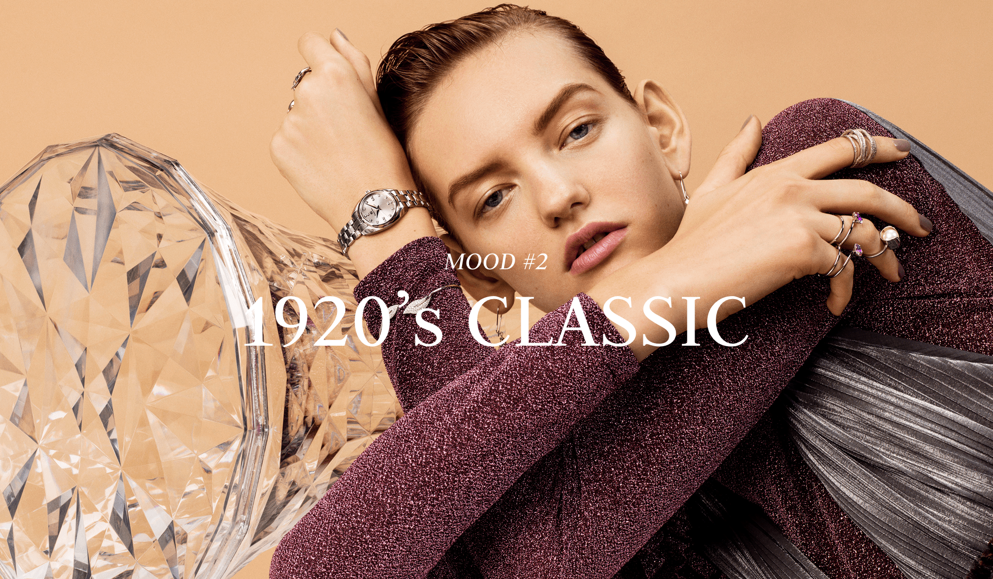 アイキャッチなアイテムを多数取り入れたコーディネートには、ホワイトゴールドのベゼルとダイヤモンドの上品な輝きが清潔感と安心感を添える。アクセサリーはシルバーをベースにしたリングや細かなダイヤモンドが輝くバングルなどを選び、全体のトーンを合わせることで、トゥーマッチにならずすっきりとまとまる。