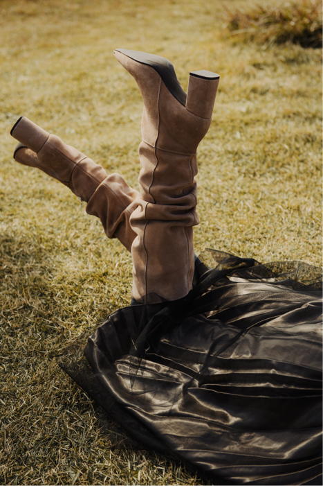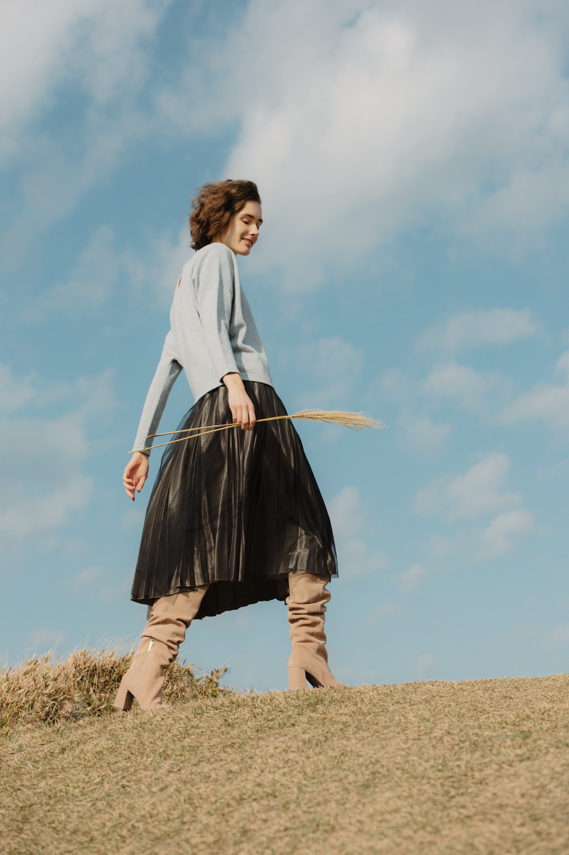 今年の冬の足元は、くしゅっとしたブーツで気負わないスタイルを楽しみたい。うすいベージュはどんなカラーの服とも相性抜群。上質なスエード素材が品のよさもきちんと残してくれる。ブーツ 2万9000円/マリアン、ニット 1万5000円、スカート 1万4000円/共にスピック&スパン