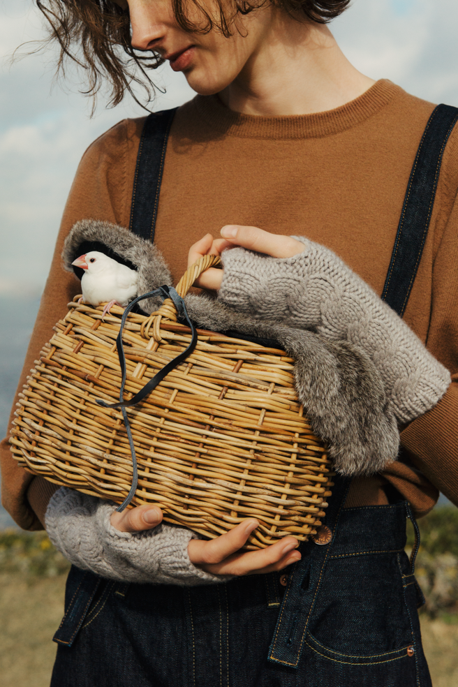冬にこそ持ちたい、ファーをあしらったリュクスなかごバッグ。ころんとした丸いフォルムもおしゃれ心をくすぐる!1点加わるだけで、ぐっと華やかな雰囲気を演出できる。かごバック 1万4800円/マルシェ、ニット 1万1000円/スピック&スパン、パンツ 2万1000円/レッド カード、グローブ 1万1000円/ランド オリンピア