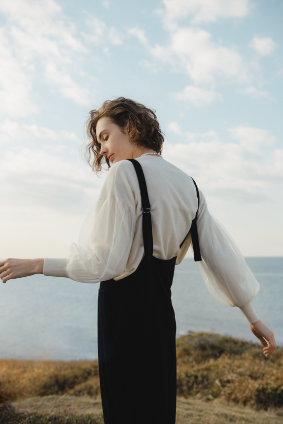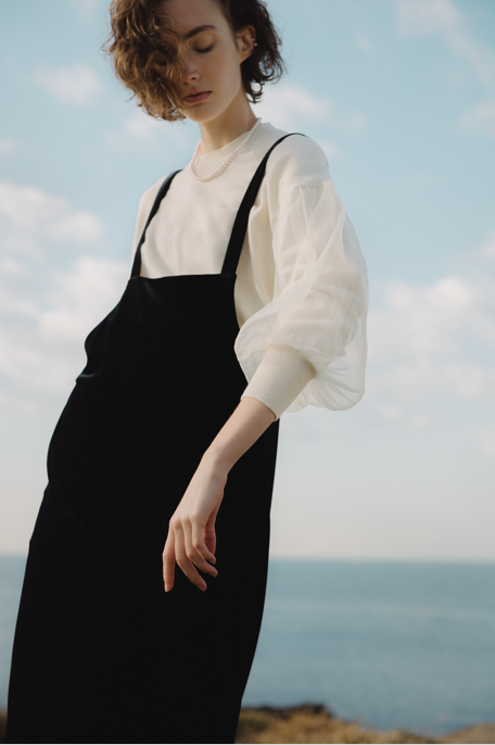 腕の部分にふんわりとしたチュール素材が施されたホワイトのニット。パールネックレスでフェミニンなムードを重ねて。サロペットはツヤ感のあるベロア素材だから、カジュアルでも大人っぽく着こなせる。サロペット 2万1000円、ニット 1万3000円/スピック&スパン、イヤーカフ 8000円、ネックレス 6万/共にリラ バイ スピック&スパン