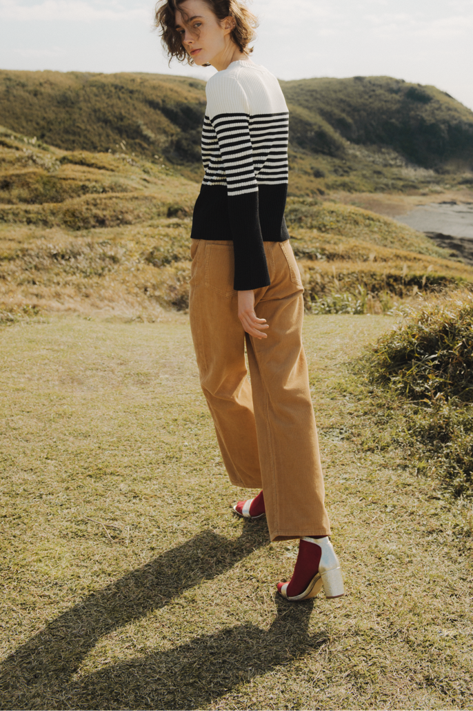 大人カジュアルの定番、ボーダーニットは、ボーダーの幅が細めのものをチョイスするのが正解。ベーシックなカラーでまとめつつも、足元には赤いソックス&ゴールドのシューズで遊び心をひとさじ。ニット 1万2000円、パンツ 1万2000円、ソックス 1600円/以上スピック&スパン、イヤーカフ 8000円/リラ バイ スピック&スパン、シューズ 1万8000円/マリアン