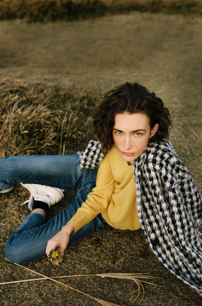 爽やかな印象のイエローニットは、パステル調の色味とやわらかな肌触りが女性らしい。毛足の長いギンガムチェックのロングコートをラフに羽織れば、上品カジュアルなスタイルが完成。コート 5万2000円、ニット 1万5000円/共にスピック&スパン、パンツ 1万9000円/レッド カード、イヤーカフ 8000円/リラ バイ スピック&スパン、ソックス 2300円/ドレドレ、シューズ 7000円/コンバース