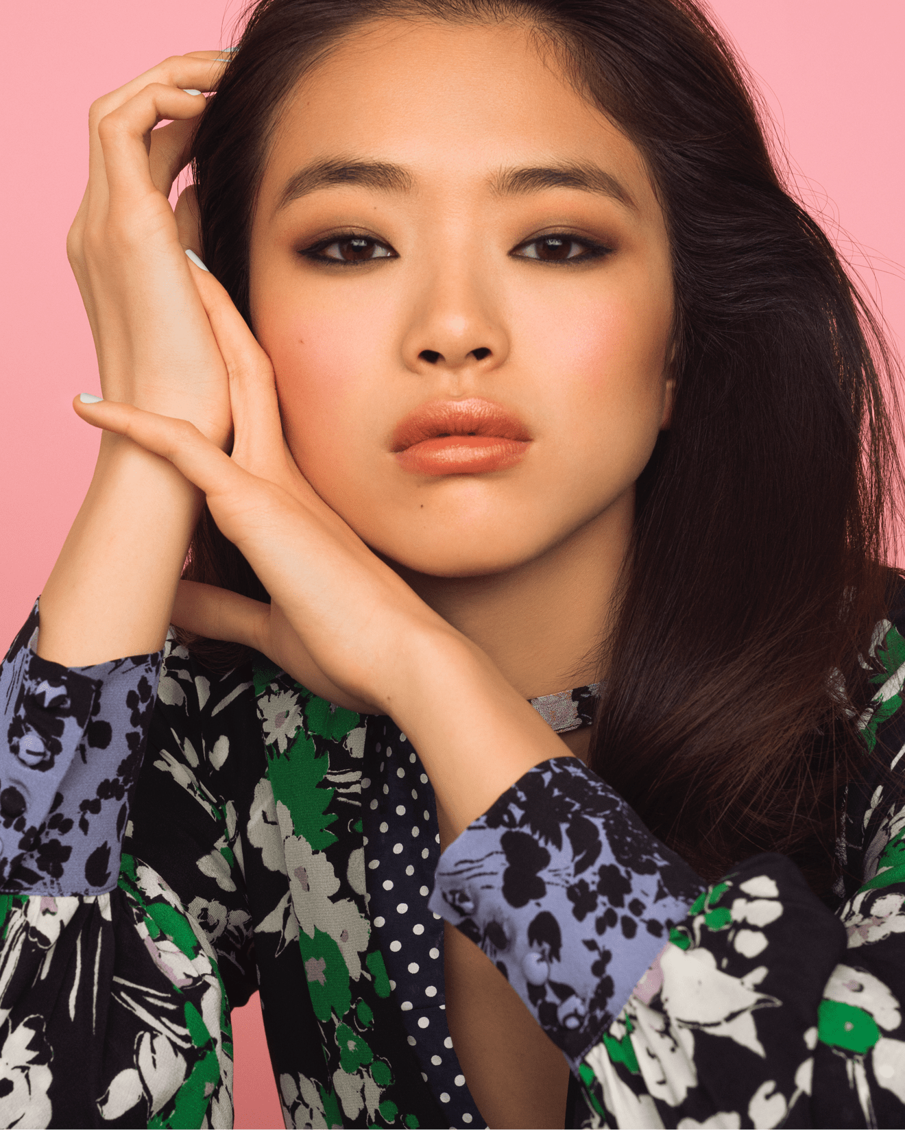 彼女自身の強さを表現したアイメイクは、アイシャドウを目元のくぼみに沿って色をのせ、ブラックのリキッドアイライナーで目を囲んだ。黒のラインが効いているにも関わらず、きつさが無く柔らかい雰囲気も兼ね備えているのは、全体的に温かみのある色合いで統一していることや肌に滑らかさがあるから。肌は、スキンケアで整えた後に艶感のある下地、そして伸びが良く素肌のように仕上がるセラムファンデーションをのせている。ファンデーションは中央から外側に流れるように手で伸ばし、本来の肌を生かした仕上がりに。チークはリキッドタイプの「リキッドブラッシュ」で血色感を出しその上からハイライトを重ねて華やかさを演出した。かわいさと大人っぽさを両立させるために、ハイライトは骨格に沿った、頬骨のラインに入れている。口元は「リップカバー」を2色使い。ベージュカラーでベースを塗り、内側から濃いコーラルカラーをオン。部分的にコーラルをのせることで、ふっくら柔らかい、立体感のある唇を作ることができる。