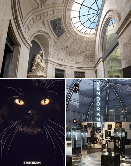 (写真上)会場となったセーヌ左岸のポンヌフとポンデザールの間に位置するモネ・ド・パリ(フランス国立造幣局)(左)3代目ジェラール・ブシュロンの飼い猫だった黒猫ウラジミールは、ヴァンドーム広場のブティックを訪れる顧客たちに幸運を招く猫としてかわいがられた(右)“キャトル”や“リフレ”コレクションを鏡の柱と光のアートで見せる展示