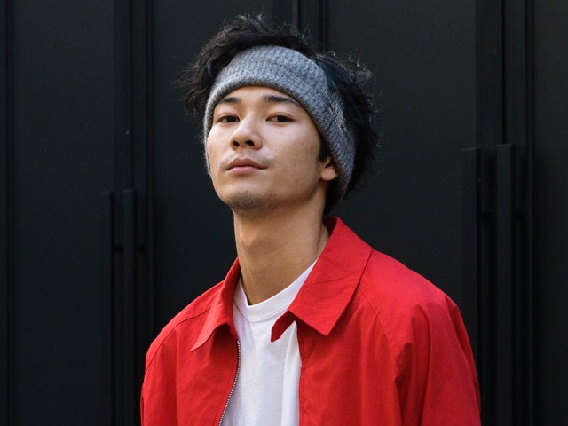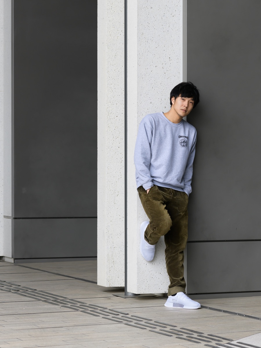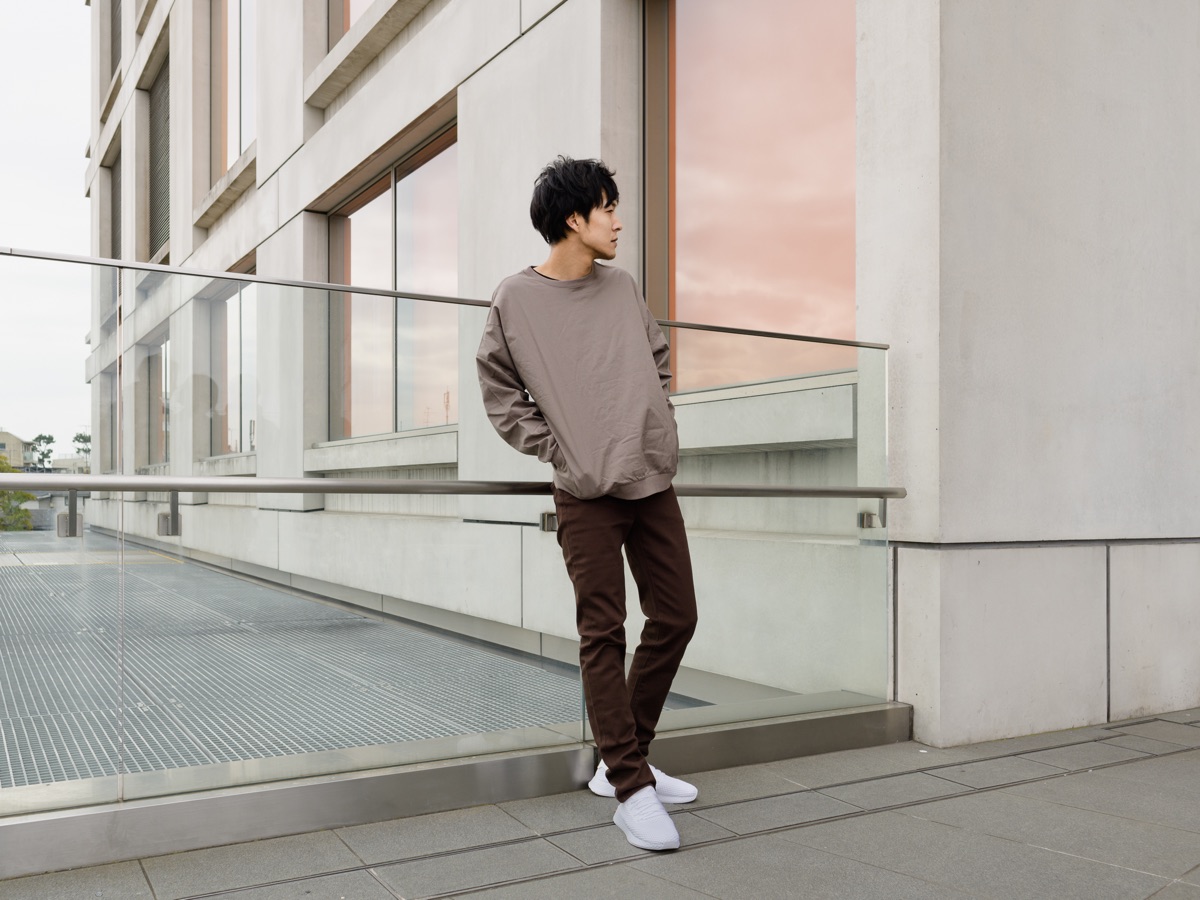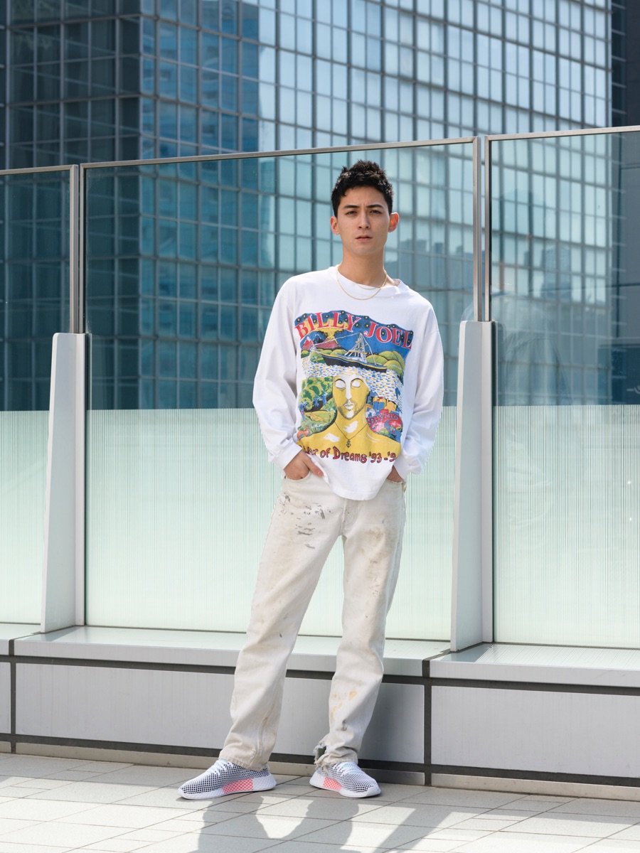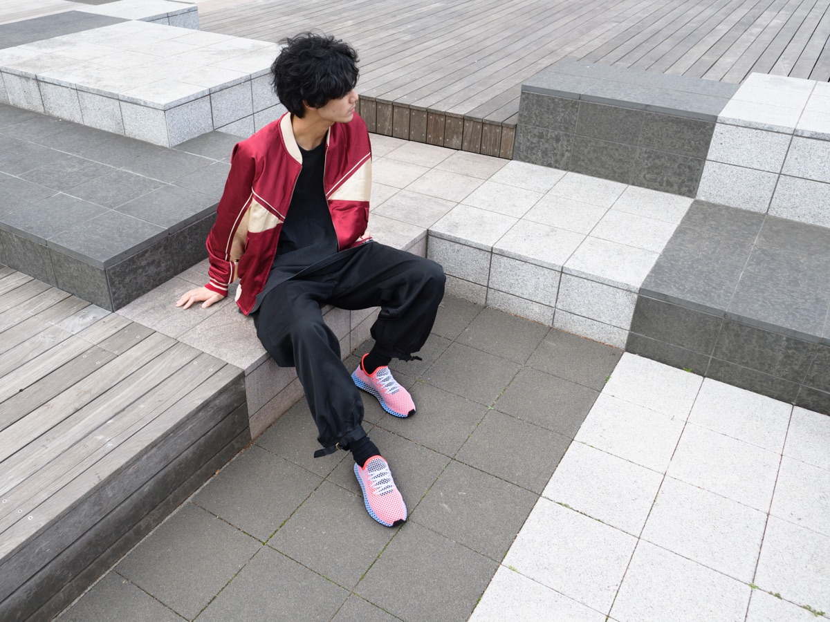 スニーカー好きの俳優・永瀬匡は、“ディーラプト”のバックボーンである80sスタイルを意識した古着ミックスのコーディネート。ハイセンスなストリートファッションに、アウトソールのピンクが映える。「履き心地にもこだわる」というスニーカーフリークも納得の表情を見せた。
