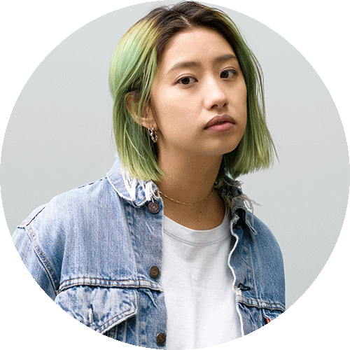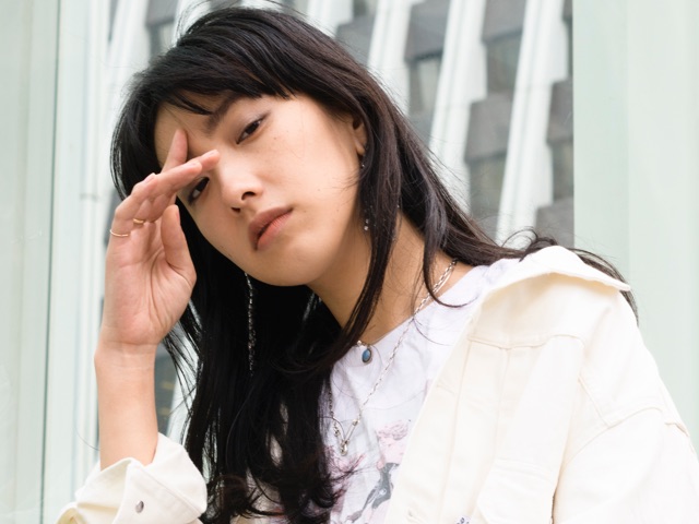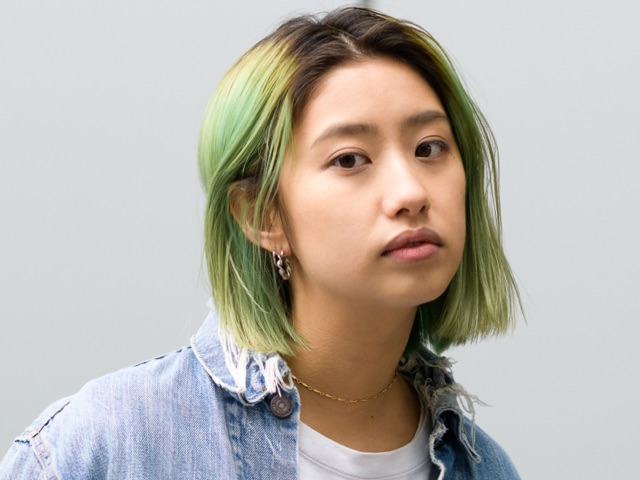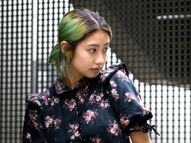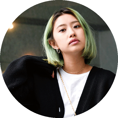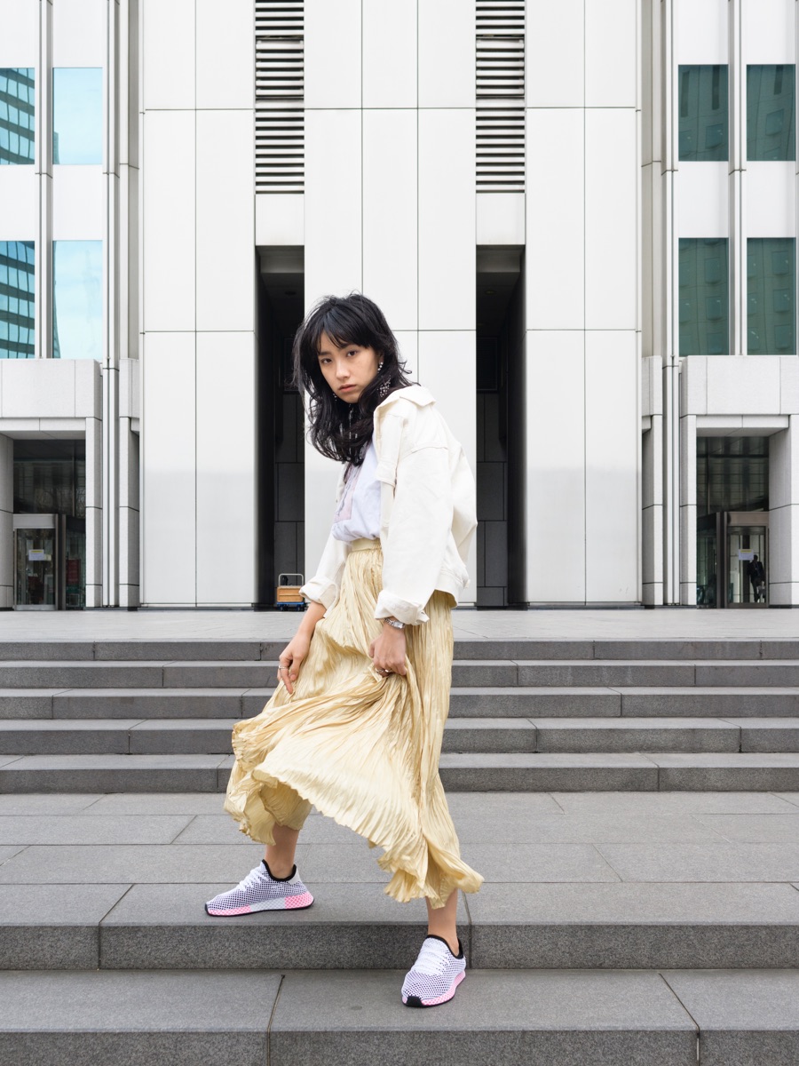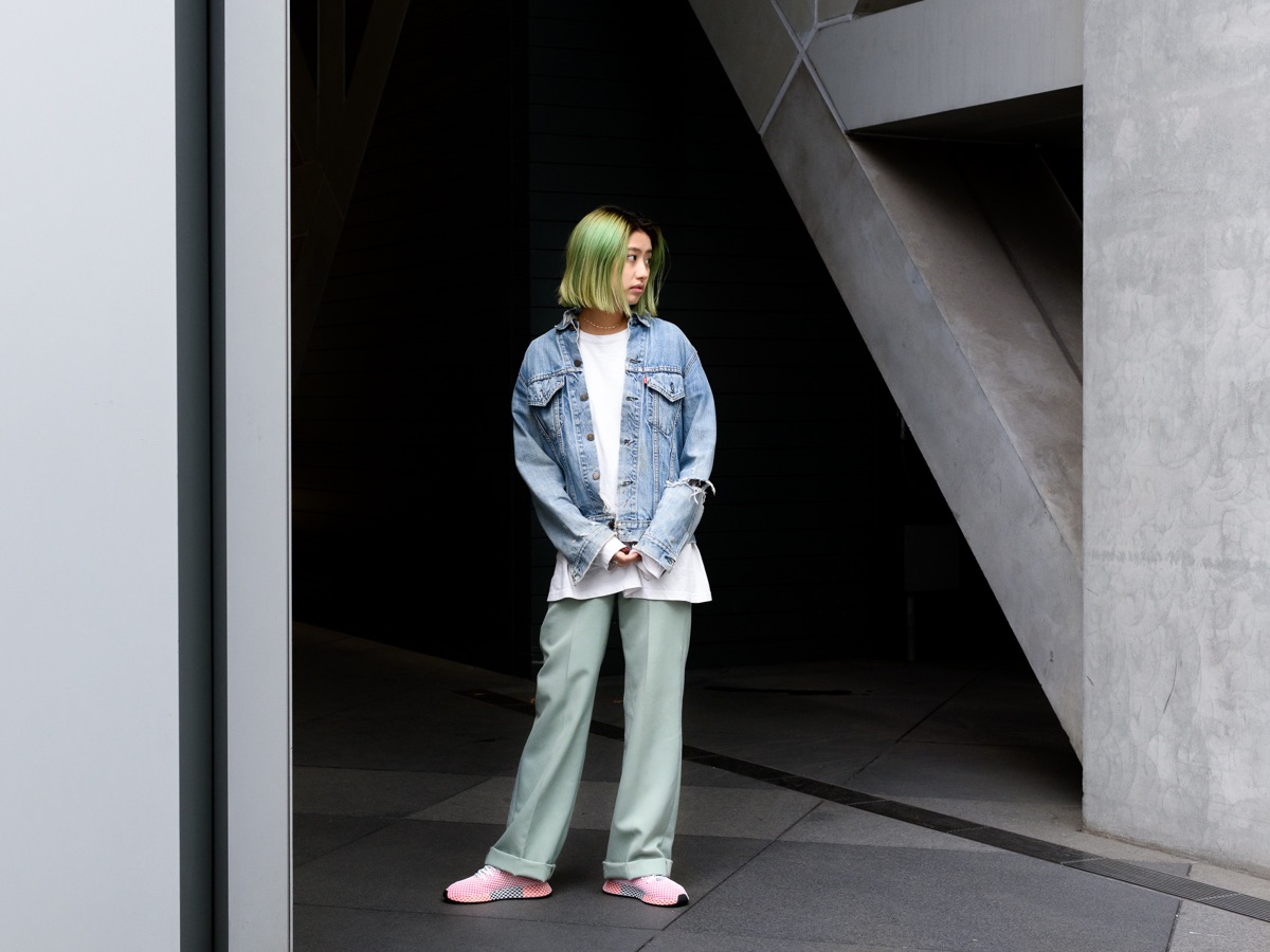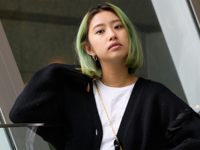 個性的なグリーンヘアーが特徴の中田みのり。趣味として始めたフィルムカメラをきっかけに写真展を開催するなど、フォトグラファーとしても活躍する。アーティスティックなセンスを生かし、“ディーラプト”で足元に春らしさをプラスするスタイリングを披露した。