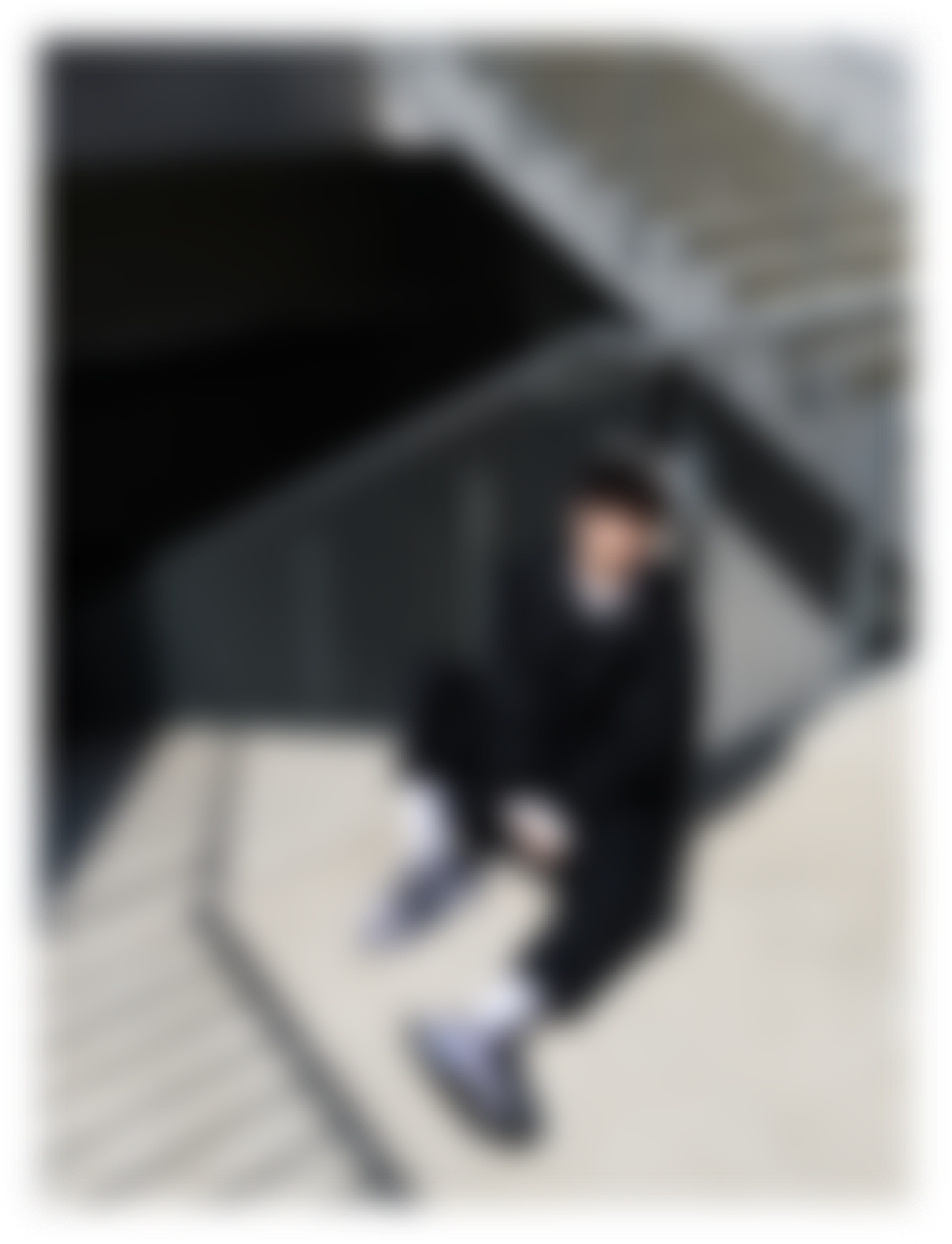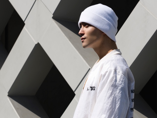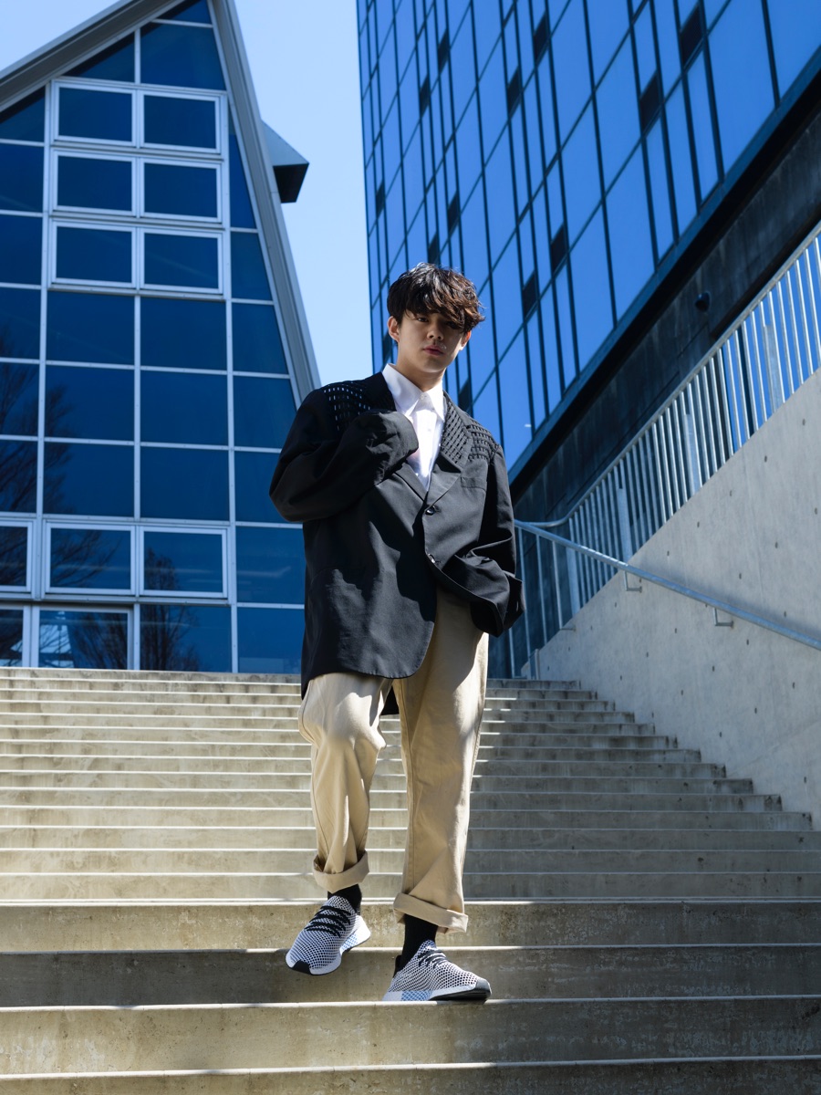 「色々なことに興味があり、なんでも挑戦したい!」と話す、現在17歳のネクストジェネレーションを代表するモデルの宇佐卓真。個性的でありながら、クールな雰囲気を帯びたスタイリングを披露した。足元はシンプルなブラックで、“ディーラプト”独特のシューズ全体を覆うネットのデザインが効いている。