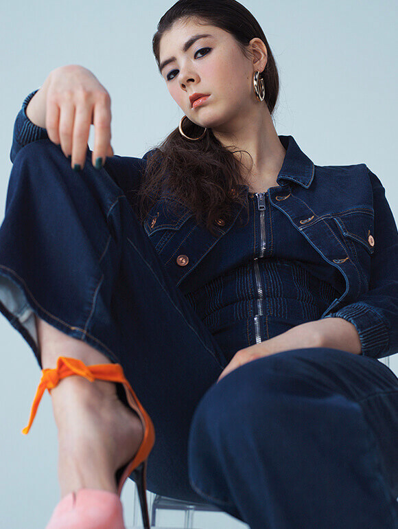 ファッションラバーの間では、もはや定番になっているデニムONデニム。さらに今季のトレンドを意識するなら、エッジの効いたダークデニムをチョイスしたい。例えばミニマルなシルエットを描く端正なジャンプスーツとジャケットのレイヤリングは、大人のマスキュランな雰囲気を漂わせる。差し色として蛍光オレンジのサンダルとヌーディなリップを投入することで、よりモードな佇まいに。