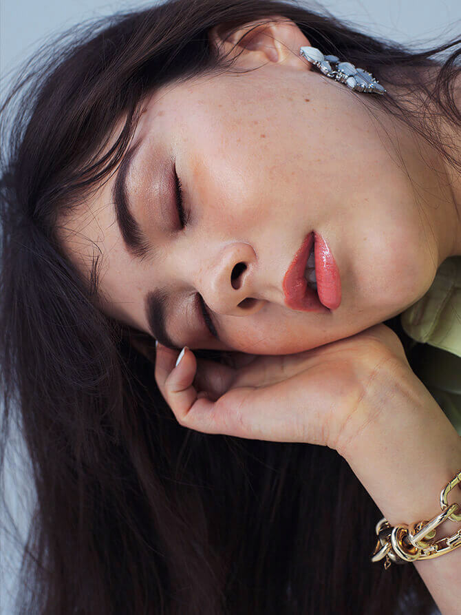 「ヘルシーな印象のコーラルベージュは、モードなルックにもぴったりのマルチプレイヤー。デニムスタイルが強めなので、あえて弱った時の女性の可愛いらしさ、二面性を表現しました。唇本来の美しさを引き立てるという意味では、このヌードコーラルが一番理想的な発色。まずはひと塗りしてみてから、バランスを見つつ、少しずつ重ね付けをして血色感を上げていくのがオススメ」
