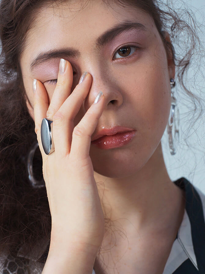 「おしゃれで上品な印象のあるベージュをベースに、3色のグリッターを渦状にブレンドしたピンクベージュのリップが主役。上唇も下唇もややオーバーめに塗ることで、微粒子のグリッターが重なり、奥行きを演出してくれます。全体のバランスとしては、眉を長めに引き、広がりを持たせることで唇が中心にくるように。最終的には、パステルカラーの服に目線が流れるようなラインを意識しました」