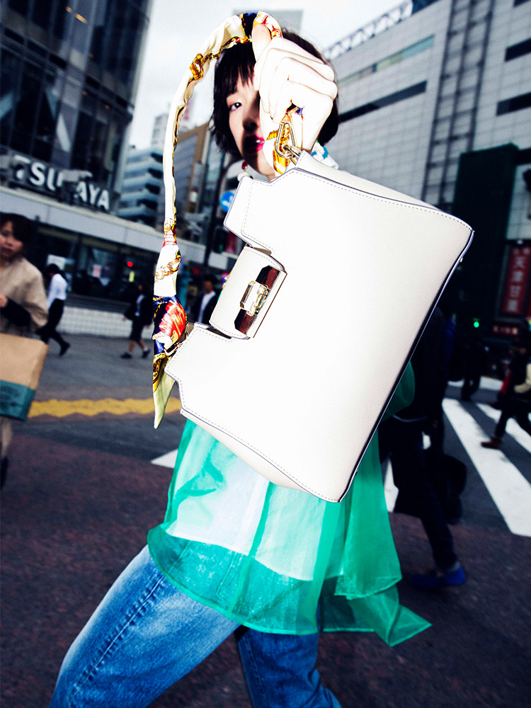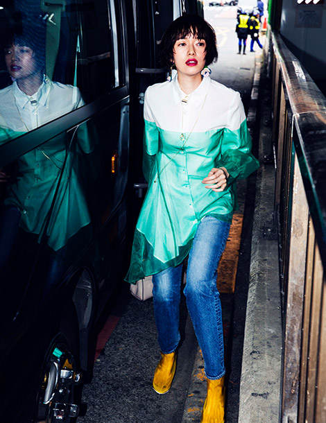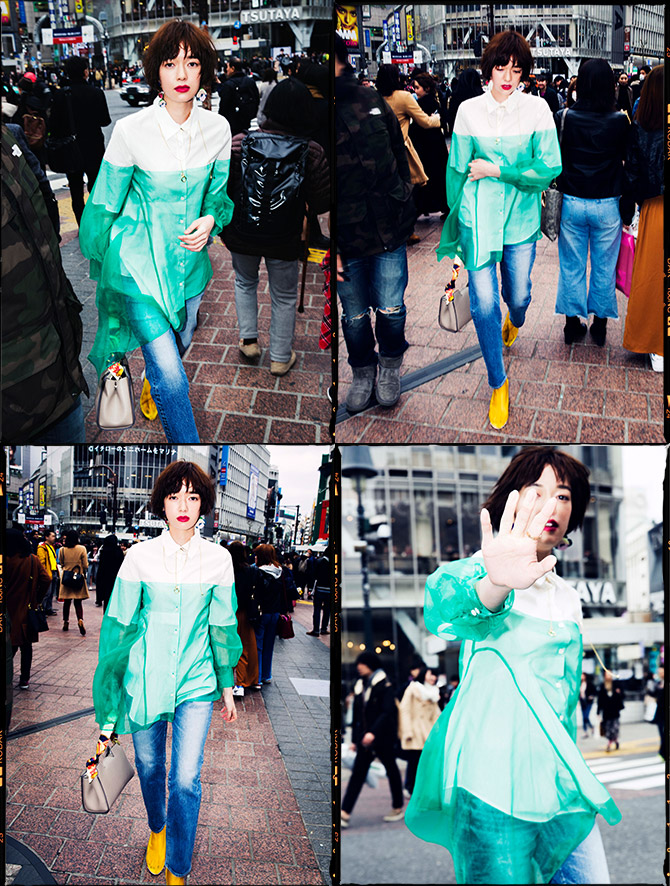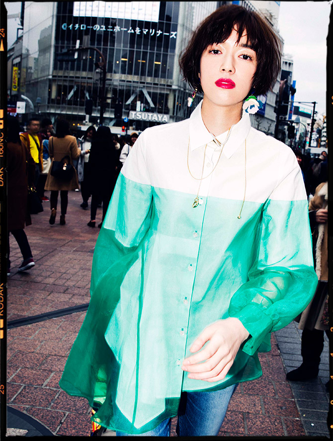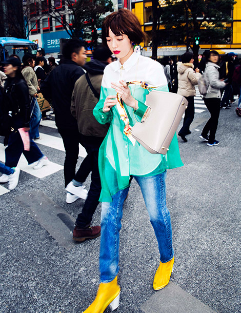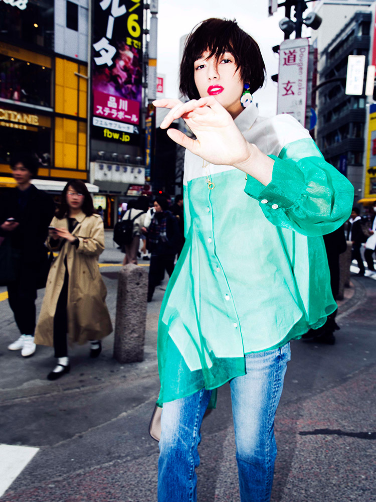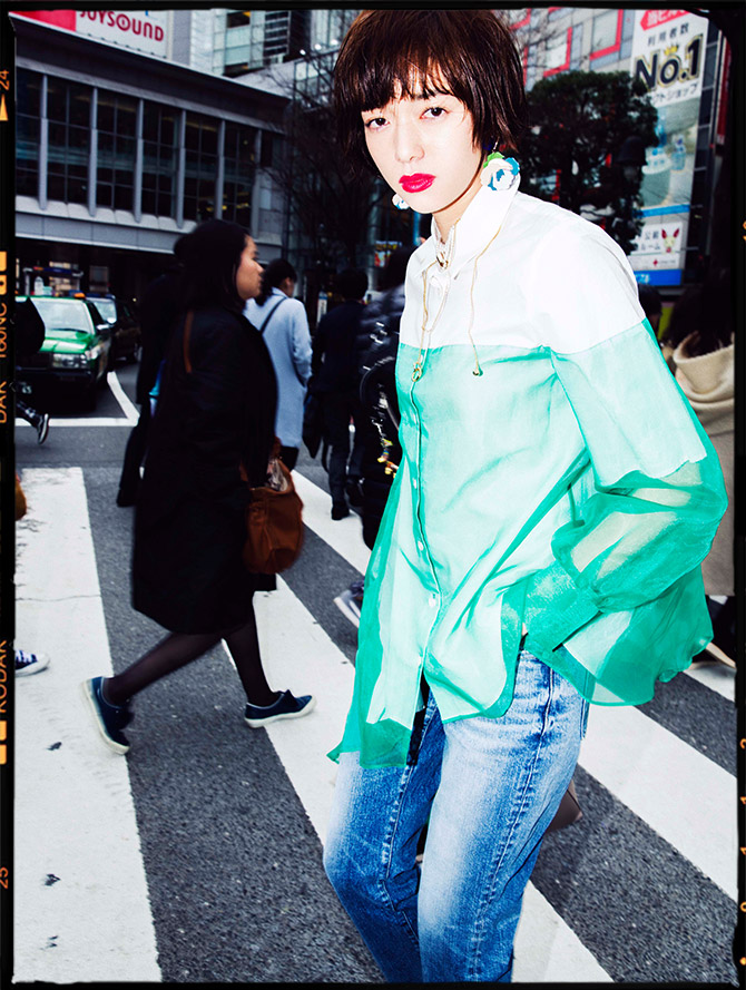 「 春デニムとして指名買いしたい『レッドカード』の“アニバーサリー”。カジュアル派の私は、腰位置からヒップにかけて少しゆとりのあるテーパードタイプをセレクト。 程よいビンテージ感とソフトなはき心地で、すっきりとした理想のラインを実現してくれるのも選んだ理由。スタイリングのポイントは、グリーンのオーガンジーをレイヤリングしたシャツと鮮やかなメッシュブーツといった、透けるアイテム同士の組み合わせ。スカイブルーのデニムを軸に、春夏らしい色遊びも心掛けました。今回の企画のテーマは“パパラッチ”ということでしたが、実は私、普段からパパラッチの方の存在に全く気がつかなくて……本当に知らないうちに撮られていたりするので、後でびっくりするんです(笑)。今日の撮影は、街の方に声をかけてもらうたびにうれしくてニヤけそうになったけれど、必死に笑顔を封印してパパラッチ撮影に挑みました!(笑)」。