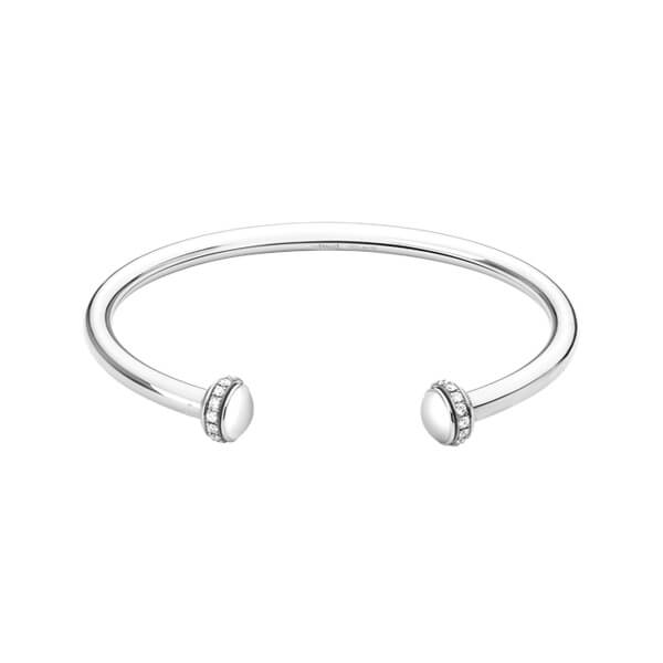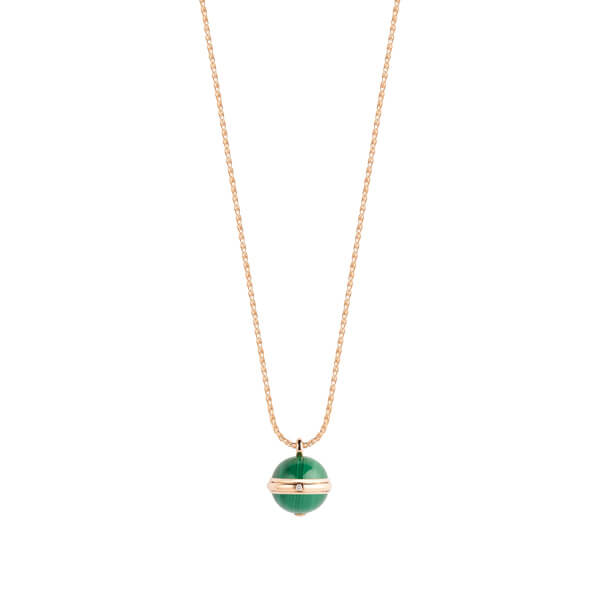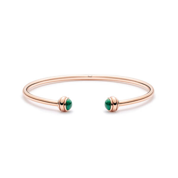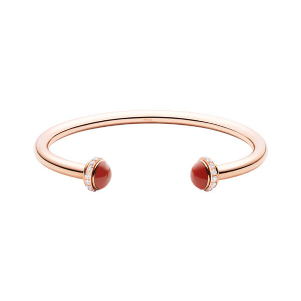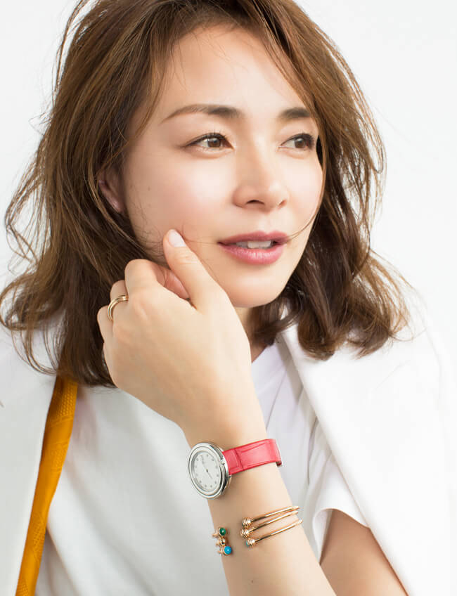 オールホワイトのスタイリングには、ポイントとなる挿し色で洗練された大人の表情に。ブレスレットはマラカイトのグリーンとターコイズの異なるカラーでまとめて、赤のストラップとのコントラストが巧緻なバランス感を生む