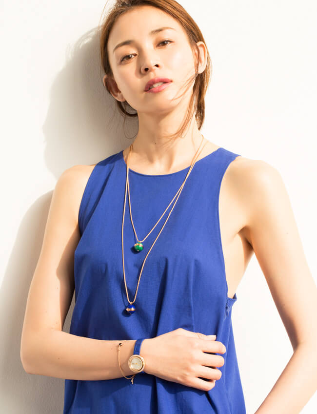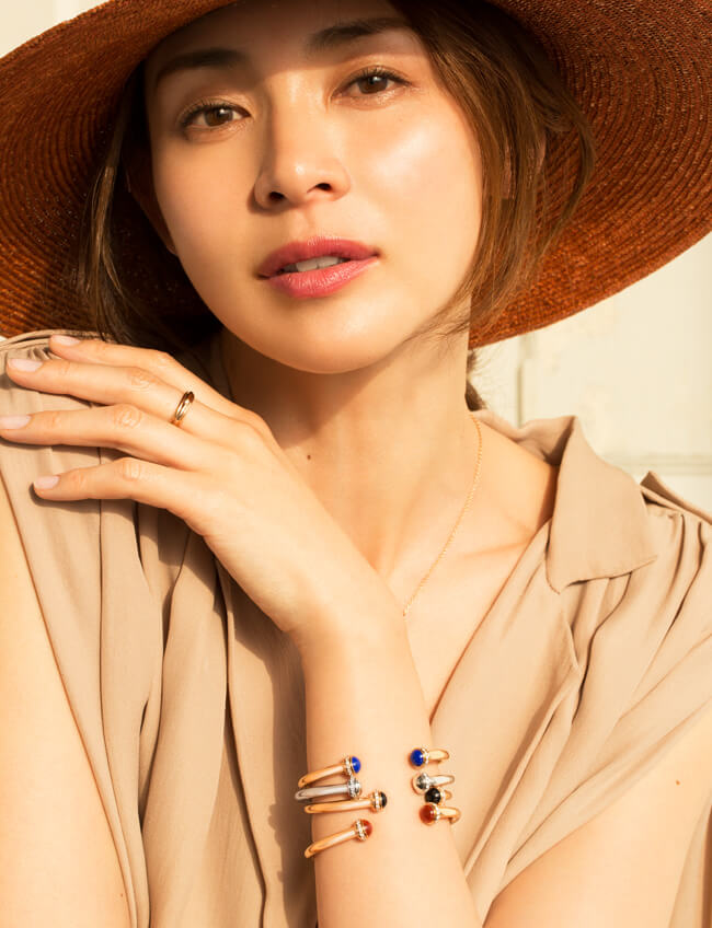 ベージュ系のヌーディーなカラーと夏らしい素材感のアイテムには、ラピスラズリやカーネリアンなど、幾重にも重なる美しい発色でメリハリを。ホワイトゴールドを1点差し込むことで一層エレガントに