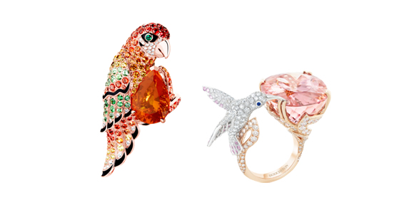 “ファジー”という名前を持った“ファジー レオパードキャット”は、ネコなどの子どもの毛が生え替わる前のファジー期から名付けられたニックネーム。創業当初から「ブシュロン」のコレクションには動物たちがモチーフとしてしばしば登場する。写真は、“ホピ”(ハチドリが幸せを運ぶという伝説を語り継ぐホピ族に由来)と“ニュリ”(インドネシア語でオウムの意)