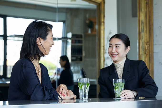 売れっ子スタイリスト・仙波レナと注目の若手実力派スタイリスト・渥美千恵。現在それぞれに活躍する2人は、さかのぼれば実は師弟の関係だ。独立するとそれぞれにいそがしく、なかなか会う機会のない2人が久しぶりにゆっくりと話したのは、つい先日リニューアルオープンして注目を集める東京・原宿の「ワンズ(Ones)」の5階に位置する「ビストロ ワンズ(Bistro Ones)」だ。スタイリストの仕事では、原宿や表参道、銀座などブランドのプレスが集まる場所での打ち合わせやリース、それぞれのアポの合間などにカフェを利用することが多いという。「普段は1階のカフェをよく利用していて、5階のビストロもずっと気になっていたんです」と仙波は言う。
