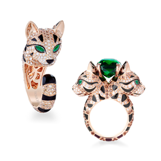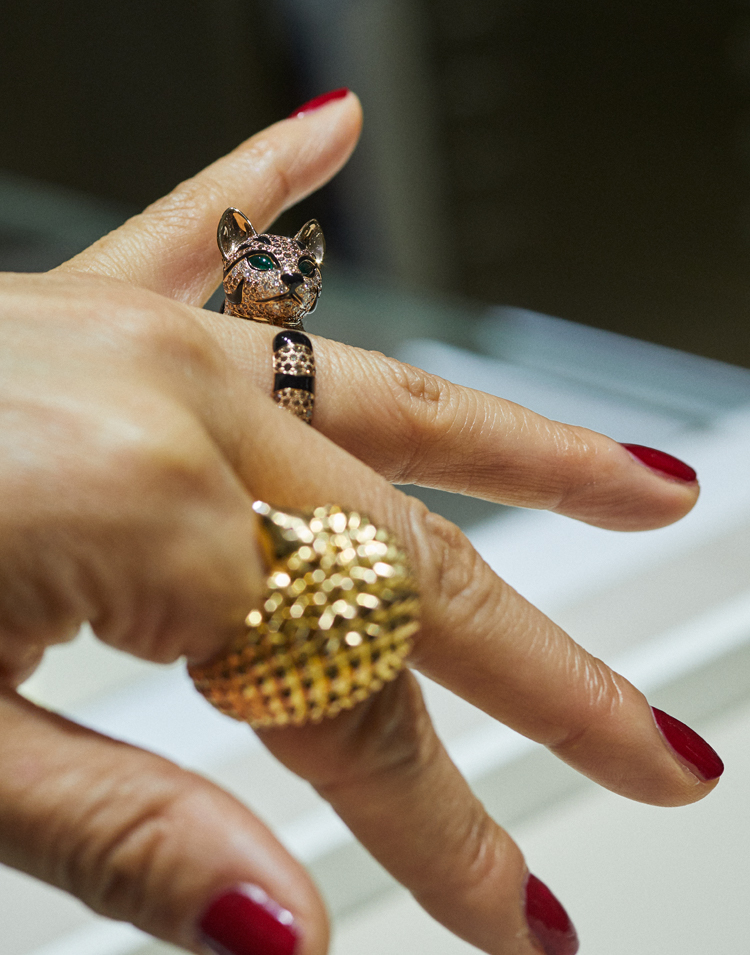 気になるというネコ科のレオパードキャットをモチーフにしたリングを試着。“ファジー レオパードキャット”(PG、シャンパンダイヤモンド、ダイヤモンド、エメラルド、ブラックラッカー)400万円