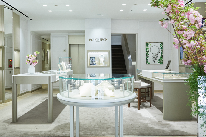 パリ・ヴァンドーム広場にブティックを開いた最初のハイジュエラー「ブシュロン」。その日本国内最大の路面ブティックは、白とゴールドを基調とした明るい空間に、人気の“キャトル”や“セルパンボエム”などのコレクションの他、ハイジュエリーや旗艦店限定のフレグランスまでフルラインがそろう。3階と4階にはゆったりとジュエリーを選ぶことができるプライベートサロンも