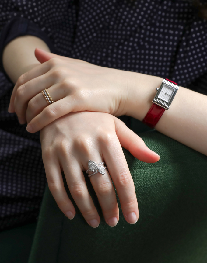 「もともと金属アレルギーで18K以下のゴールドは着けらなかったため、必然的に本物のジュエリーだけを持つようになりました。今着けている“セルパンボエム”はピンクゴールド、ホワイトゴールド、イエローゴールドの3つのリングを重ね着けするだけで、一気にエレガントさが増すのでお気に入りです。へビがモチーフのリングは、お守りのように私を守ってくれるので毎日着けていたいんですよね。その他にも両親から譲り受けたリングは特に大切に身に着けています。