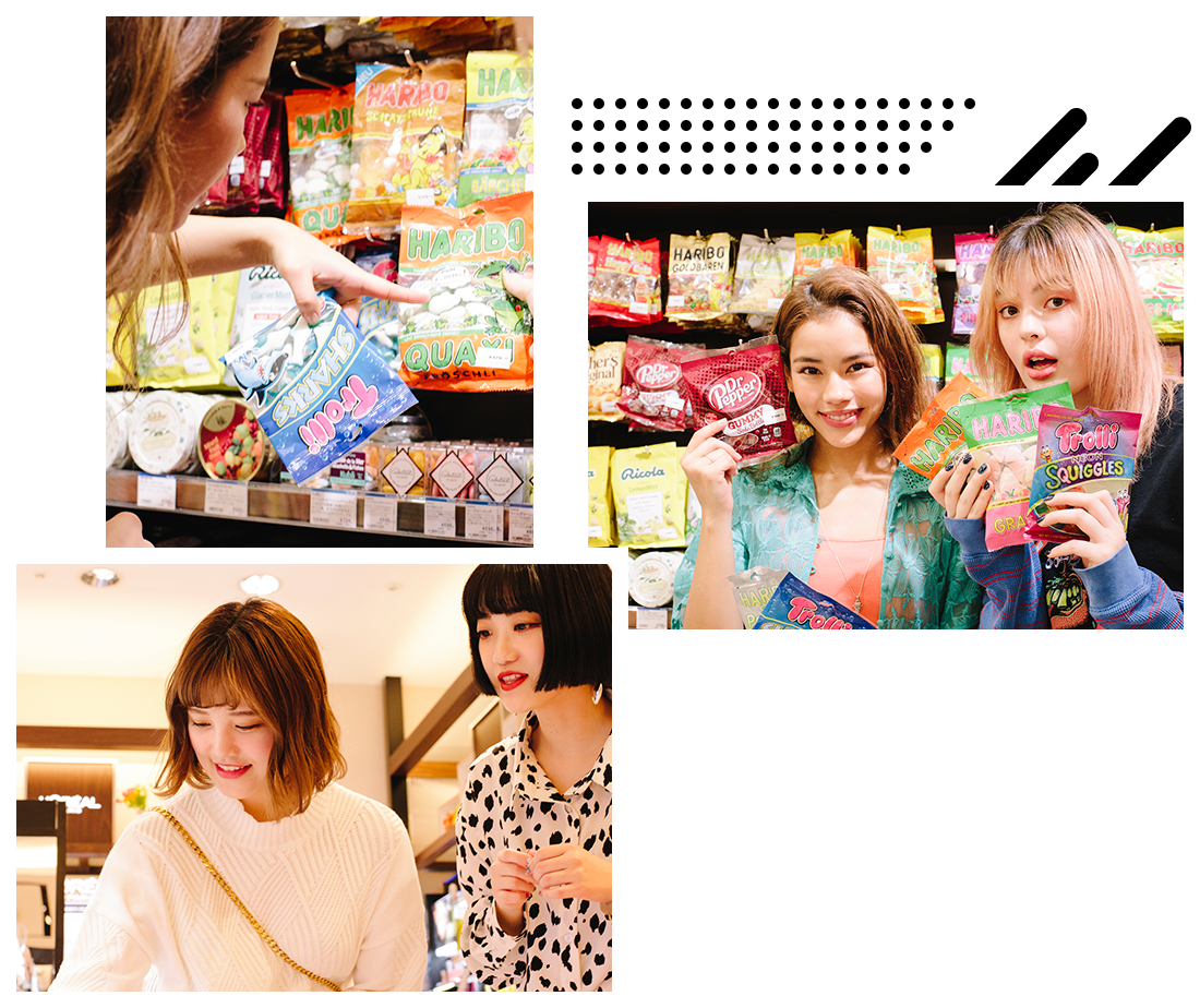 店内にはお菓子やコスメをはじめ、アパレル、キッチングッズ、文房具など驚くほど幅広いアイテムが並ぶ。日本ではなかなか見かけないインポートアイテムも豊富!5人も思わず本気のお買い物モードに