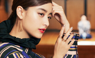 伝統を重んじる寄席の場では、レトロモダンなルックをチョイス。大人のレディーなら、指先にも手を抜かないのがお約束。“エレサ・ペレッティ”のウエーブリングは、波をイメージした魅惑的なデザインで、しなやかなゴールドの質感が肌と優しく溶け合う。「流れるようなシルエットが独特で、存在感がありますね。女性らしいデザインなので、ドレスアップしたい日に最適です」(山本美月)