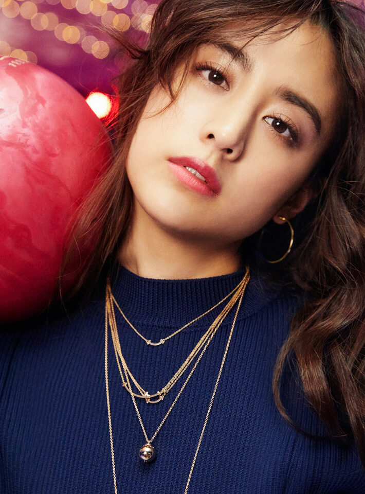 袖が広がったトップスにアームウオーマーを重ねたハイブリッドな装い。胸元には、ブランドイニシャルである“T”をスマイルマークの曲線にアレンジしたマイクロペンダントを重ねて、思い切り遊び心をオン。「このスマイルモチーフは、ポップになりすぎず、大人っぽく着けられるデザイン。マイクロサイズを1つだけ着けてもかわいいし、贅沢に重ね着けしても印象がガラリと変わってすてき!」(山本美月)