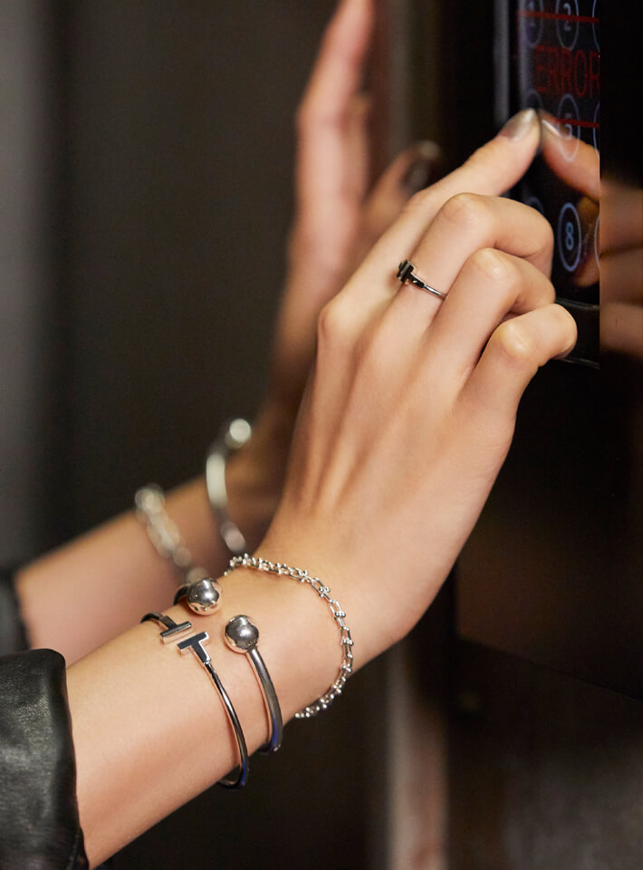 (右手、手首側から)“ティファニー ハードウェア マイクロ リンク ブレスレット”[SIL] 4万2500円、“ティファニー ハードウェア ボール ワイヤー ブレスレット”[SIL] 5万6000円、“ティファニーT ワイヤー ブレスレット”[18KWG] 21万円、(中指)“ティファニーT ワイヤー リング”[18KWG] 9万9000円、(左手、手首側から)“ティファニー ハードウェア ボール カフ ブレスレット”[SIL] 5万6000円、“ティファニー ハードウェア リンク ブレスレット”[SIL] 6万7000円
