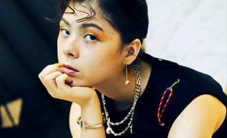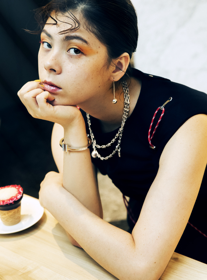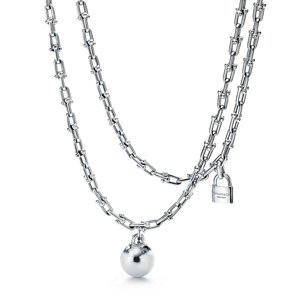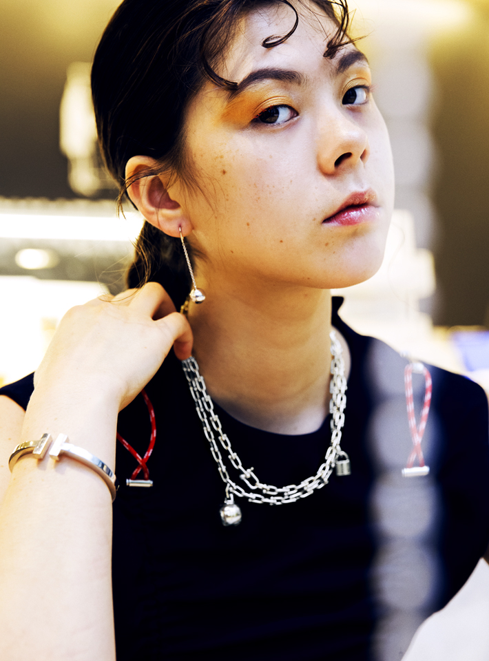 “ティファニー ハードウェア”からチョイスしたのは、スターリングシルバーの繊細ながらも強い輝きをまとったラップネックレス。大ぶりのチェーンに、ボールモチーフと南京錠のキーチャームというインパクトのある大胆なデザインに思わず目が釘付け。「ベーシックカラーのコーデだからこそ、こういった存在感のあるネックレスでモードなアクセントを加えたいです」(エモン久瑠美)