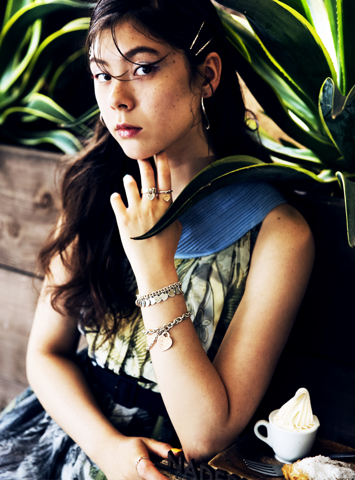 フクロウのプリントを配したプレイフルなドレスワンピが軽快なムードを誘う。手元には、「ティファニー」のアイコニックなキーリングからインスパイアされた、ハートタグのブレスレット&リングで、かわいさの中にほんのりエレガンスを添えて。「つけているアイテムは全てハートモチーフ! シルバーで統一することでポップになりすぎず、洗練された雰囲気に」(エモン久瑠美)