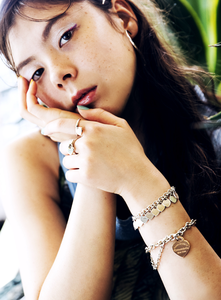 (手首上から)“リターン トゥ ティファニー ダブル チェーン ハート タグ ブレスレット”[SIL×ルベドメタル] 8万1000円、“リターン トゥ ティファニー マルチ ハート タグ ブレスレット”[SIL] 5万4000円、“エルサ・ペレッティ オープン ハート フープ ピアス”[SIL] 6万4000円、(左手人さし指)“リターン トゥ ティファニー ハート タグ リング”[SIL×ルベドメタル] 4万9500円、(左手中指)“リターン トゥ ティファニー ラブ ロック リング”[SIL] 6万7000円、(右手人さし指)“ティファニーT ワイヤー リング”[18KWG] 9万9000円