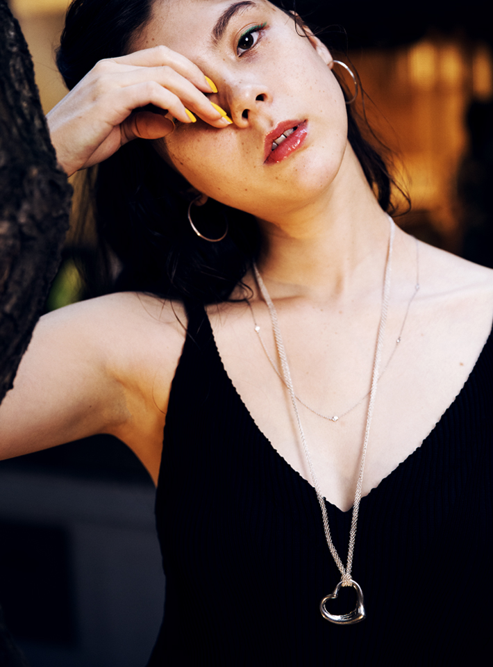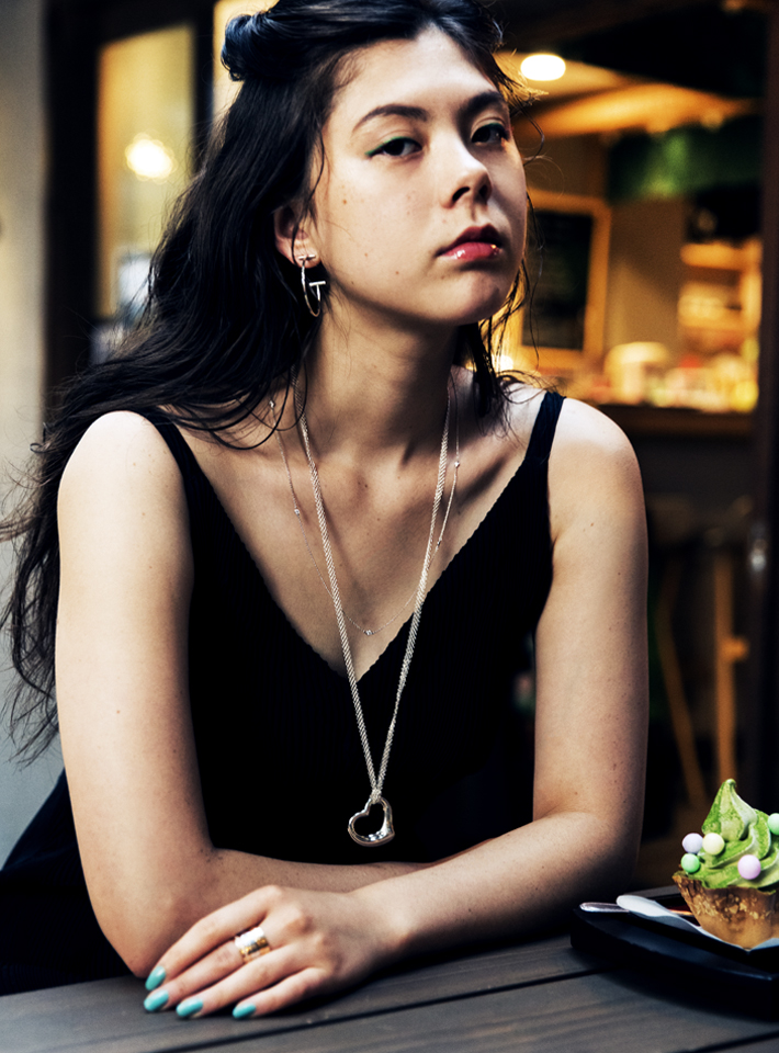 胸元にフェミニンな存在感をもたらすのは、流れるような美しいラインが魅力の“エルサ・ペレッティ オープン ハ―ト ペンダント”。有機的な曲線とメッシュのチェーンがスタイリッシュなコントラストを描き、モダンなドレスをより一層引き立ててくれる。「愛らしいハートのモチーフは、甘くなりすぎず上品な印象。カジュアルにもドレッシーなスタイルにも合わせやすいので、重宝しそう」(エモン久瑠美)