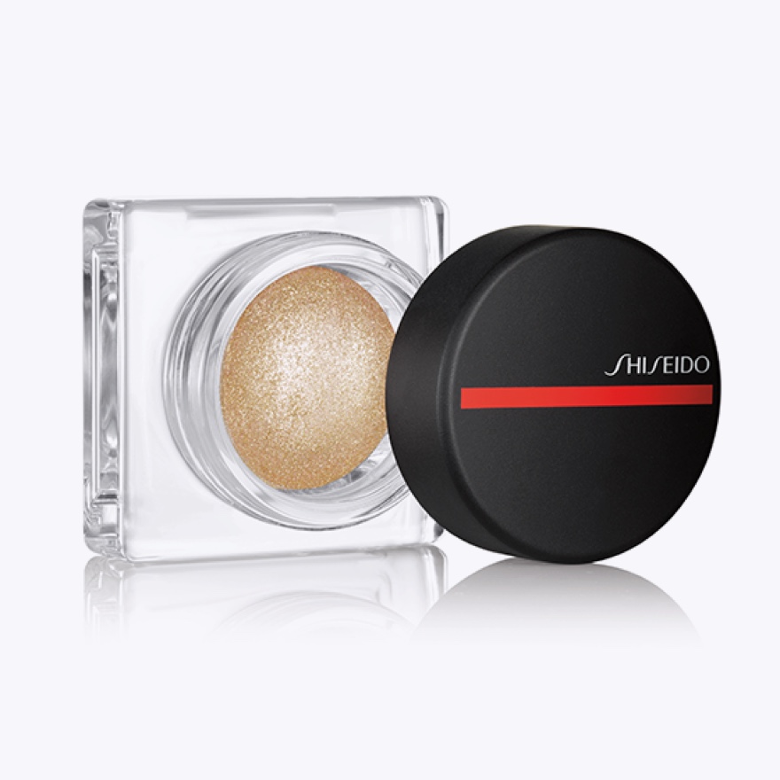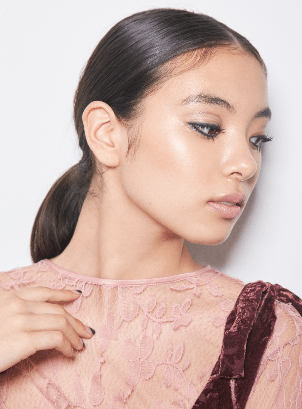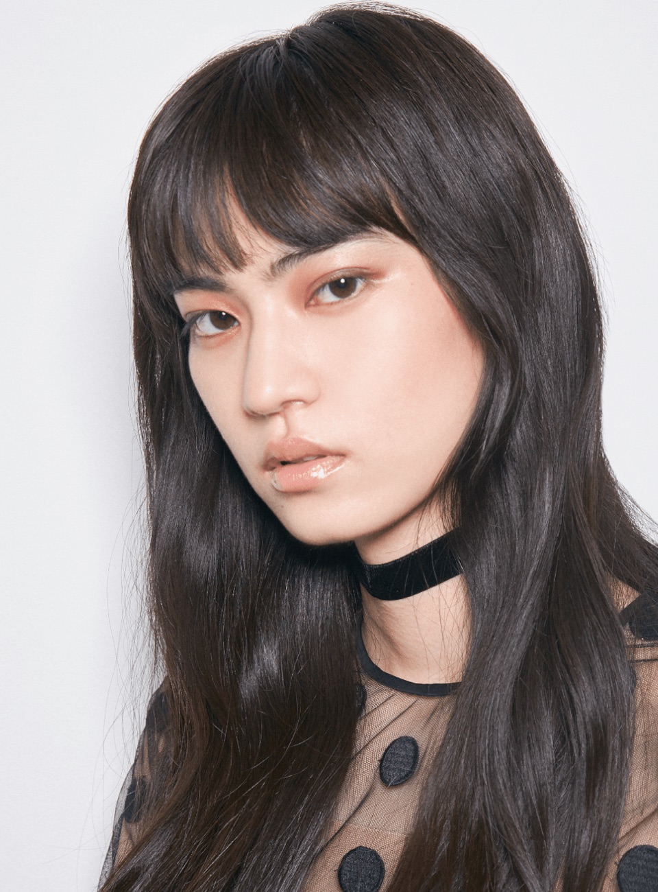 少女のように可憐なムードとシャープな表情を共存させるHaruna Matsuiは、艶をたたえたヌーディなメイクに挑戦した。「普段から目もとにポイントを置いたメイクをよくしますが、艶をメインにした目もとは新鮮。ブラウンとオレンジを軽くアイホールにのせ、その上からシルバーの『オーラデュウ』をたっぷりと使いました。リップもピンクベージュでヌーディにまとめています。この秋冬はカラーライナーも気になる。赤やピンクなどでワンポイント加えたい!」