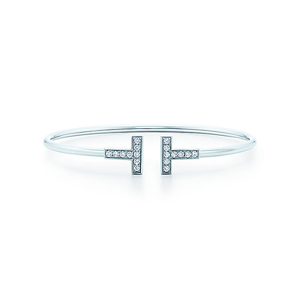 (手首上から)“ティファニーT ワイヤー ブレスレット”[18KRG] 21万円、[18KWG] 21万円、[18KWG×DIA] 42万5000円、“ティファニー メトロ ヒンジ バングル”[18KWG×DIA] 87万5000円、“ティファニーT ワイヤー バー ピアス”[18KRG] 13万4000円