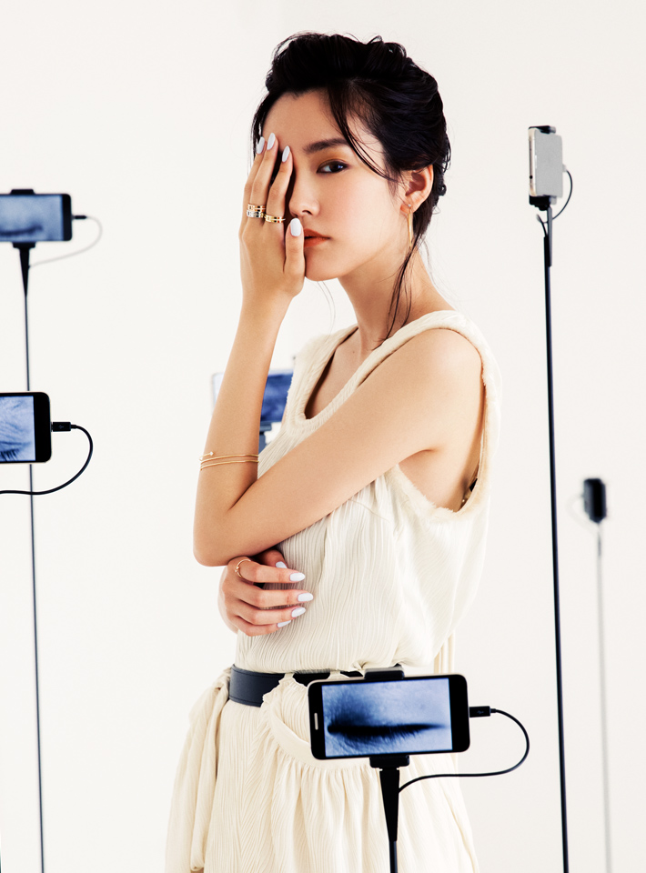 デザイン性のあるポケットがアクセントとなった白のドレスルック。指先には、グラフィカルなアングルとクリーンなラインが融合した“ティファニーT”モチーフのリングを重ね、強いインパクトを狙って。「幅のあるリングは存在感があるので、普段は単体でつけることが多いのですが、これなら重ねてもちゃんと上品で女性らしい雰囲気になるから不思議。重ねて遊ぶことで魅力が倍増しますね」(桐谷美玲)