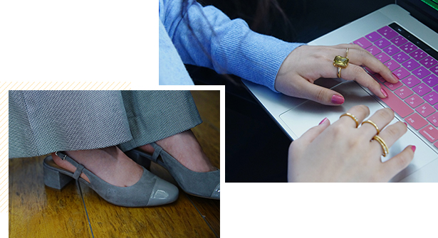 ニット8900円、パンツ1万4000円、サンダル1万4000円、ネックレス3900円、リング(右手人さし指、中指、薬指、左手中指)[5点セット]6900円、ビジューリング(左手人さし指)4900円/以上、全てバナナ・リパブリック(表示価格はすべて税込)