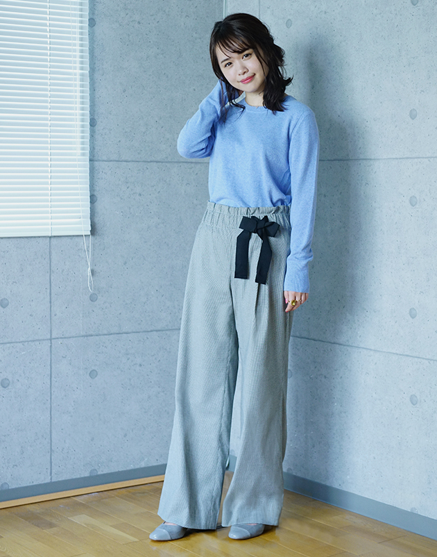 ペールトーンの「モテ」コーディネートは、肌触りのよいセーターをタックインしてすっきりシルエットに。「ファッションは仕事優先で選ぶことが多くて、動きやすい服がメーンかな。最近はパンツが好きです。あと、モテカラーである淡い色は外せないアイテム(笑)。だから今日のコーデは自分らしくてとても好みです!」 。