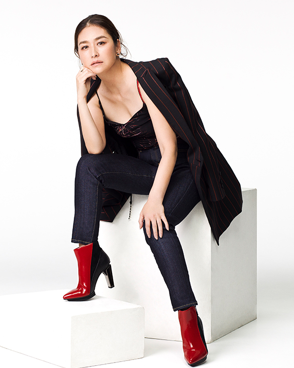 ドレスアップを狙うなら、キャミソールトップでヘルシーな肌見せを。さらにマスキュランなジャケットを羽織ればクラス感のある着こなしに。「レッドカードは細身だけれど窮屈でなく、TPOに合わせて幅広いスタイルを楽しめるのがうれしいですね」(亜希) デニム “アニバーサリー ハイライズ” [26403HR-rns] 1万9000円/レッドカード(ゲストリスト 03-6869-6670)、ジャケット 9万5000円、キャミソール 3万4000円/共にピンコ(ピンコ ジャパン 03-5778-9861)、イヤリング 2万円、リング 1万6000円/共にグロッセ(グロッセ・ジャパン 03-5413-6039)、シューズ 4万9000円/ユナイテッド ヌード(エム 03-3498-6633)