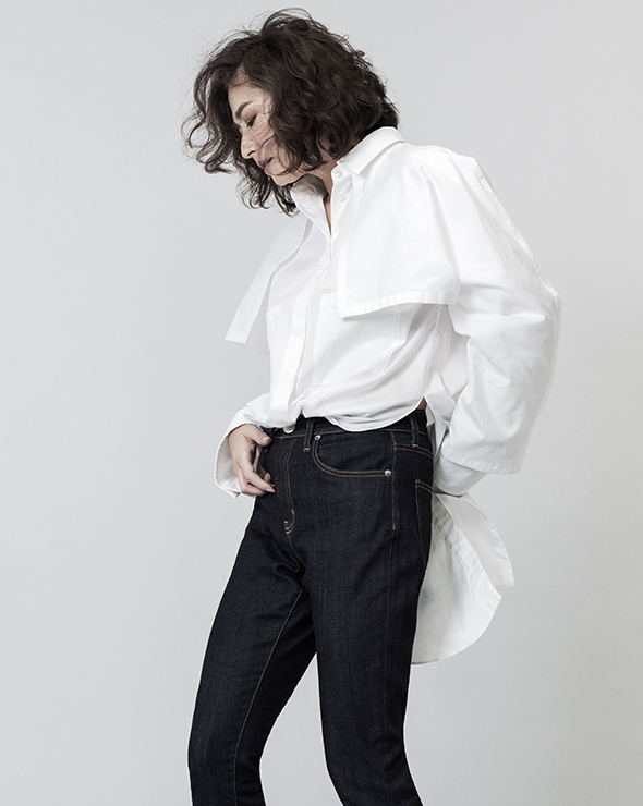 白シャツ×デニムは誰もが持っている定番アイテム。変化を加えるなら、肩や袖にボリュームをもたせた構築的なシェイプのシャツをチョイスして。デニム “アニバーサリー ハイライズ” [26403HR-rns] 1万9000円/レッドカード(ゲストリスト 03-6869-6670)、シャツ 3万5000円/ザ ケイジ(イジットアンドコーリミテッド 表参道 03-3499-7355)
